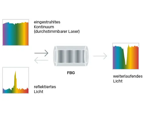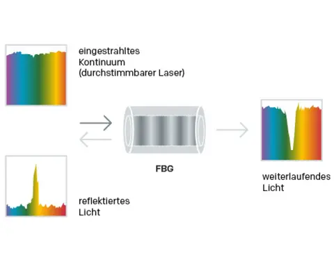 FBGs sind periodische Brechungsindexmodulationen innerhalb der Faser, die eine bestimmte Wellenlänge reflektieren. Ändert sich Temperatur oder Dehnung, verschiebt sich diese reflektierte Wellenlänge. Mehrere FBGs mit unterschiedlichen Bragg-Wellenlängen können entlang einer Faser integriert und gemeinsam ausgelesen werden.