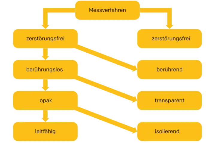 Zerstörende oder halbzerstörende Messverfahren, wie beispielsweise die Querschnittsanalyse, werden hier nicht behandelt. Ebenso werden berührende oder taktile Messverfahren auf dieser Seite nicht besprochen und im Diagramm lediglich der Vollständigkeit halber erwähnt.