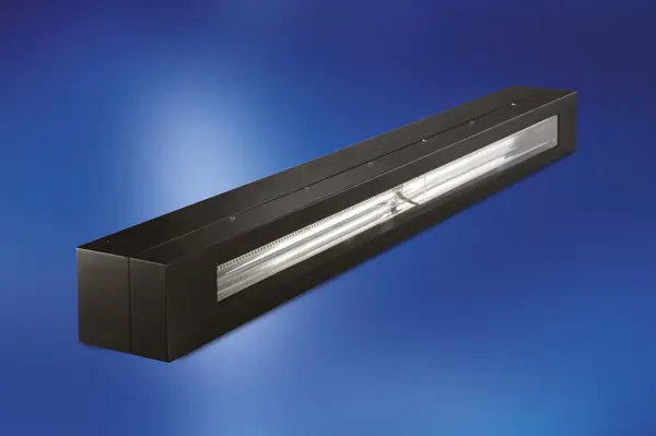 Die 60-Zoll-Linearlampe (1,5 m) wird für großflächiges UV-Härten und photonisches Sintern in Inline-Anwendungen im Rolle-zu-Rolle-Verfahren verwendet. Zwei Einzellampen mit elliptischen Reflektor sind so kombiniert, dass das Licht über einen großen Bereich mit exzellenter Homogenität abgestrahlt wird.