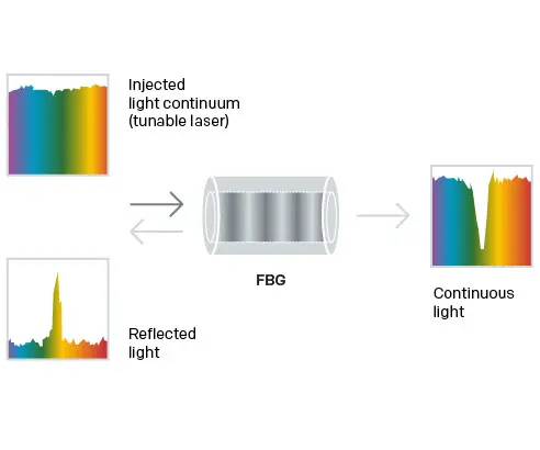 FBGs are periodic refractive index modulations within the fiber that reflect a specific wavelength. If the temperature or strain changes, this reflected wavelength shifts. Several FBGs with different Bragg wavelengths can be integrated along a fiber and read out together.