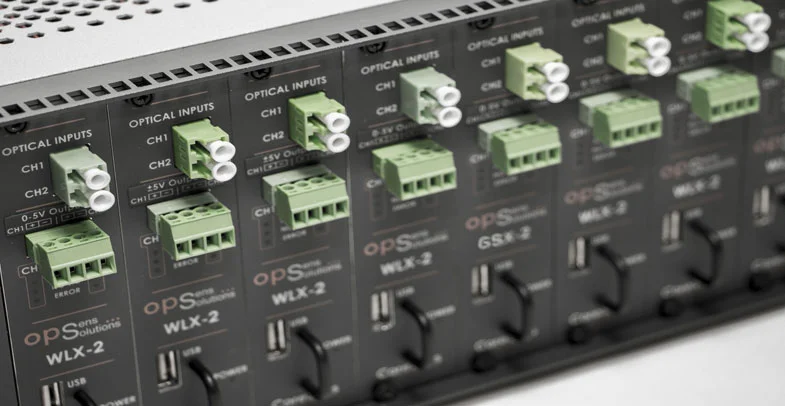Both module types can be combined in a single housing. Each module has two fiber optic measuring channels with a sampling rate of up to 1,000 Hz and two analog outputs.