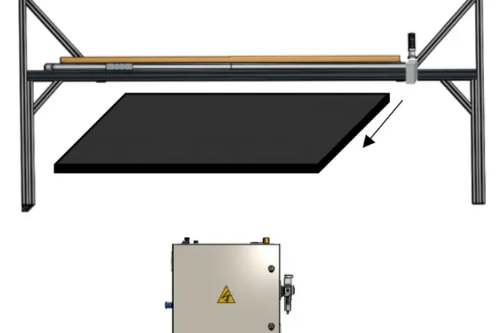 The conveyor belt integration consists of a frame, a protective housing for the measuring head, an automated axis for moving the head, a recalibration and protection box, and a control cabinet. The axis, measuring head, and its protection are mounted on the frame. The recalibration and protection box is located at the zero position of the axis. The control cabinet is positioned on one side of the line, connected to the measuring head, and transmits the data to the external system.