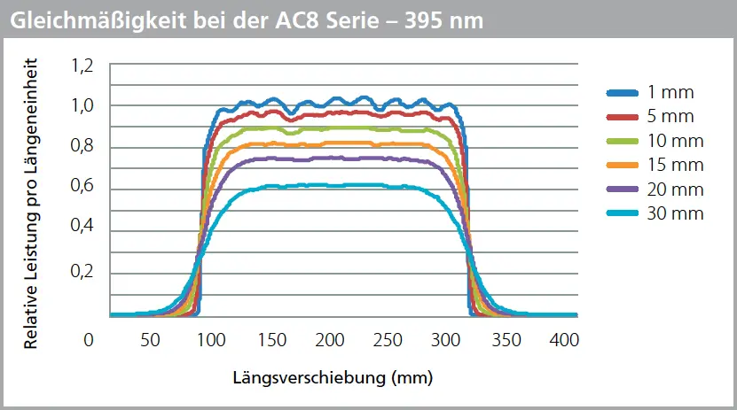 | Available in 395 nm and 365 nm | Ability to select the optimal wavelength for the adhesive, coating, or ink, as well as the substrate that best suits the specific application |
