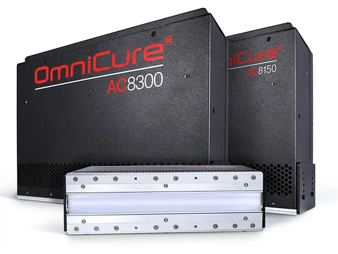 The OmniCure® AC8150/AC8150P, AC8225/AC8225P and AC8300 air-cooled UV LED curing systems are designed with state-of-the-art, customized front-end optics for powerful, high peak radiation. The systems deliver over 8 W/cm2 peak radiation for fast, uniform curing at long working distances. “P” versions of the AC8 series (AC8150P and AC8225P) have extended optics to optimize dose for short working distances required for printing applications. By customizing performance to meet the needs of the industry, the new AC8 Series product range can be used in a wide variety of applications with different process requirements.