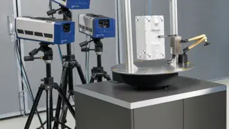 RoboVib® Bench enables automated and full-body experimental modal analysis using Polytec’s optical 3D scanning laser vibrometers. Its easy to set-up hardware and software integrates seamlessly into the Polytec scanning vibration measurement workflow and saves time by automatically repositioning the devices-under-test (DUT) instead of a manual and tedious relocation of the sensor setup. 360° measurements of the DUT are as easy as a measurement from just one side.