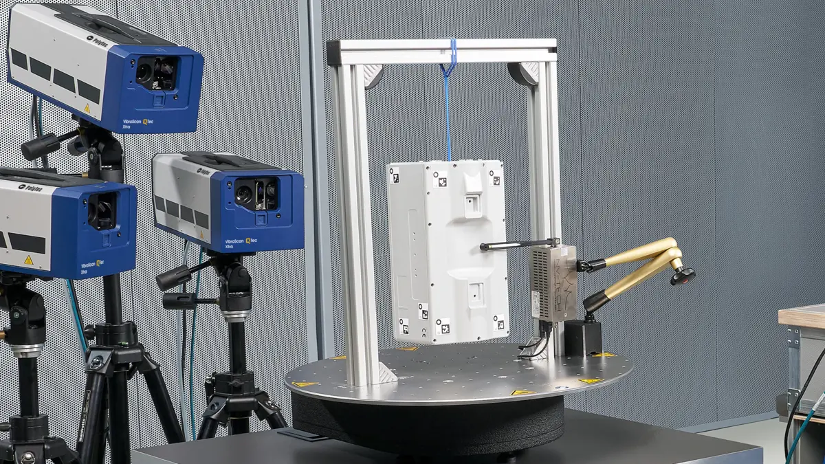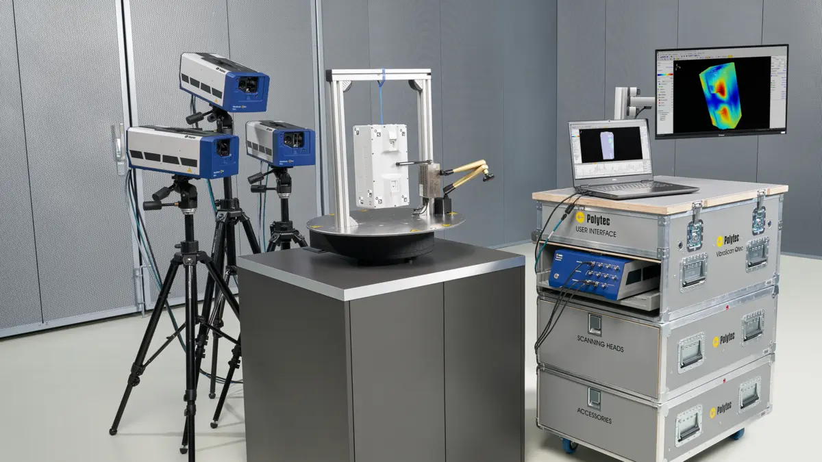 RoboVib® Bench enables automated and full-body experimental modal analysis using Polytec’s optical 3D scanning laser vibrometers. Its easy to set-up hardware and software integrates seamlessly into the Polytec scanning vibration measurement workflow and saves time by automatically repositioning the devices-under-test (DUT) instead of a manual and tedious relocation of the sensor setup. 360° measurements of the DUT are as easy as a measurement from just one side.