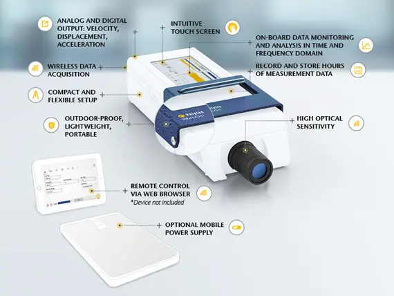 If you are looking for a portable, multi purpose and non-contact vibration sensor system, VibroGo® is the ideal solution. Use the lightweight tripod for fast setups. Stay independent with the mobile power supply for 3 hours operation time. Safely measure machinery vibrations on difficult to access or hazardous areas due to high voltage, temperature or radiation from a distance.