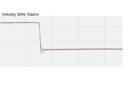 During the measurement the velocity was recorded as a function of the time. The measurement also allowed to record the velocity of the watch case for 8 specific measurement points during approximatively 8 ms; 3 ms before the impact and 5 ms after the impact. An overlay of the velocity traces allows for a comparison of the different measurement points and can be seen in the displacement graph. The graphs also show different behaviors during the impact.