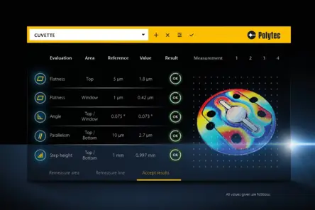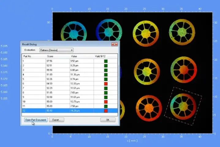Pour s'assurer que chaque pièce respecte les tolérances de planéité et donc les critères de qualité, il est possible de mettre en œuvre une routine de mesure pour un contrôle de qualité à 100 %. Des options logicielles personnalisées permettent de s'adapter à des besoins de test spécifiques et à des mesures de routine, de sorte que des recettes de mesure simples peuvent être stockées et exécutées. La définition de tolérances individuelles de planéité et la comparaison immédiate avec la valeur mesurée permettent d'obtenir des résultats de type "réussite-échec". La variation du placement de l'échantillon est détectée et l'évaluation est automatiquement adaptée à la nouvelle position grâce à la reconnaissance automatique des formes. Cela garantit une reproductibilité élevée, même dans des environnements exigeants.