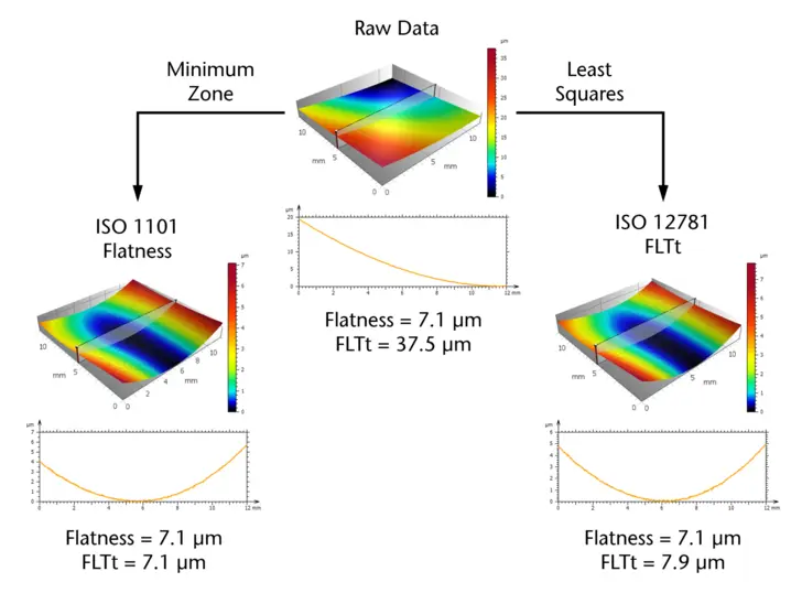 La norme ISO 1101 définit que la distance entre deux plans parallèles doit être aussi petite que possible tout en incluant tous les points de mesure. Dans la norme ISO 12781, la planéité est définie de manière beaucoup plus générale comme la distance entre le point minimum et le point maximum de deux plans, dont la distance dépend des enlèvements de forme appliqués précédemment. Quelle que soit la norme ISO utilisée, il est important d'éliminer efficacement les valeurs aberrantes dans l'ensemble des données afin d'éviter que des pointes uniques ne dominent le résultat de la mesure.