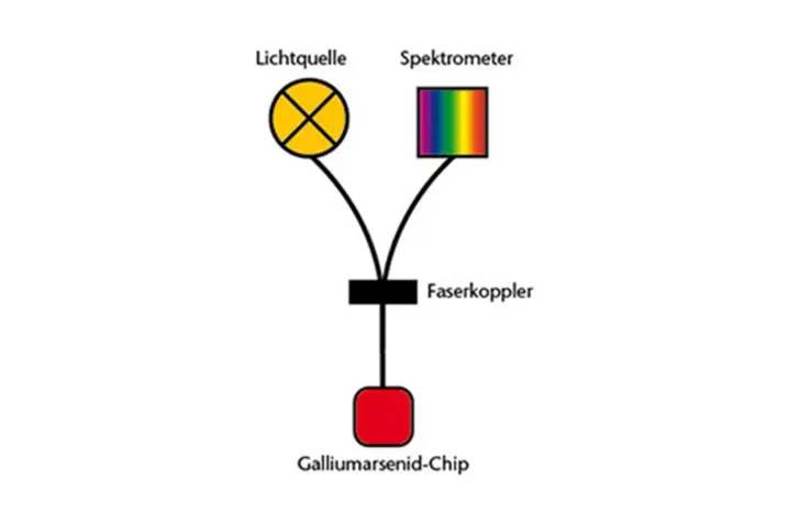 At the tip of an optical fiber, a GaAs crystal is mounted to use the long-proven method of temperature-dependent band-edge shift. White light is sent from the system to the crystal, and there the position of the current band edge—which shifts spectrally with temperature at about 0.4 nm/K—is altered. The light reflected back from the crystal end is analyzed with a spectrometer to determine temperature, based on factory calibration. The temperature measurement range is from –200 °C to +300 °C, with accuracies up to 0.1 °C.