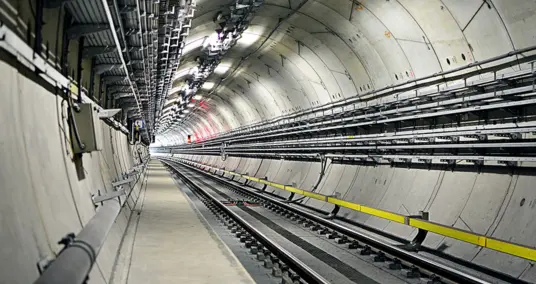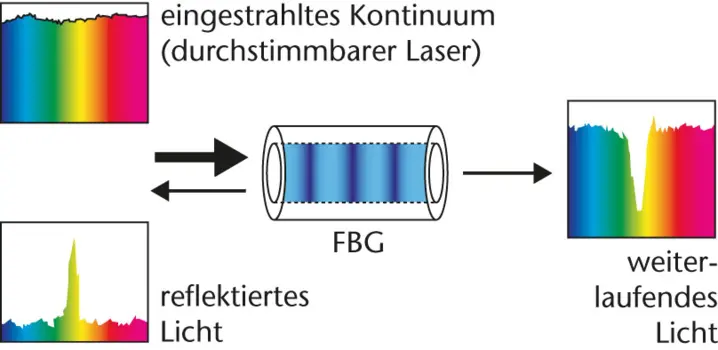 Fiber Bragg Gratings are created by exposing the fiber at specified positions to a periodic pattern of intense UV light. The refractive index of the fiber in those locations is “modulated.” In this way, sensors are “written” into a standard glass fiber at arbitrary positions. The grating reflects light in a narrow wavelength range which shifts when temperature or strain change. Several hundred FBGs can be written into a single fiber and queried simultaneously with one system. This technology allows monitoring of temperature, strain, and also acceleration or tilt in large structures, for example in design validation of new constructions or structural health monitoring of buildings. Temperature range: –50 to +300 °C (with special fibers even up to +800 °C), with achievable accuracy up to 0.1 °C and spatial resolution around one millimeter.
