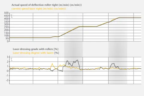 L'image représente une visualisation des données de mesure capturées par un système de capteur de vitesse laser dans le processus industriel de laminage à froid. Les changements décrits dans la vitesse ou la position du matériau plat permettent de créer des modèles, indiquant des mouvements réguliers ou périodiques, des fluctuations ou des irrégularités dans le paramètre mesuré. Sur la base de ces données, l'automate programmable peut synchroniser et harmoniser toutes les étapes du processus et réguler le flux de masse.