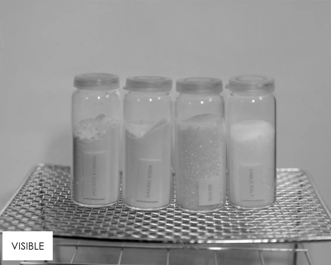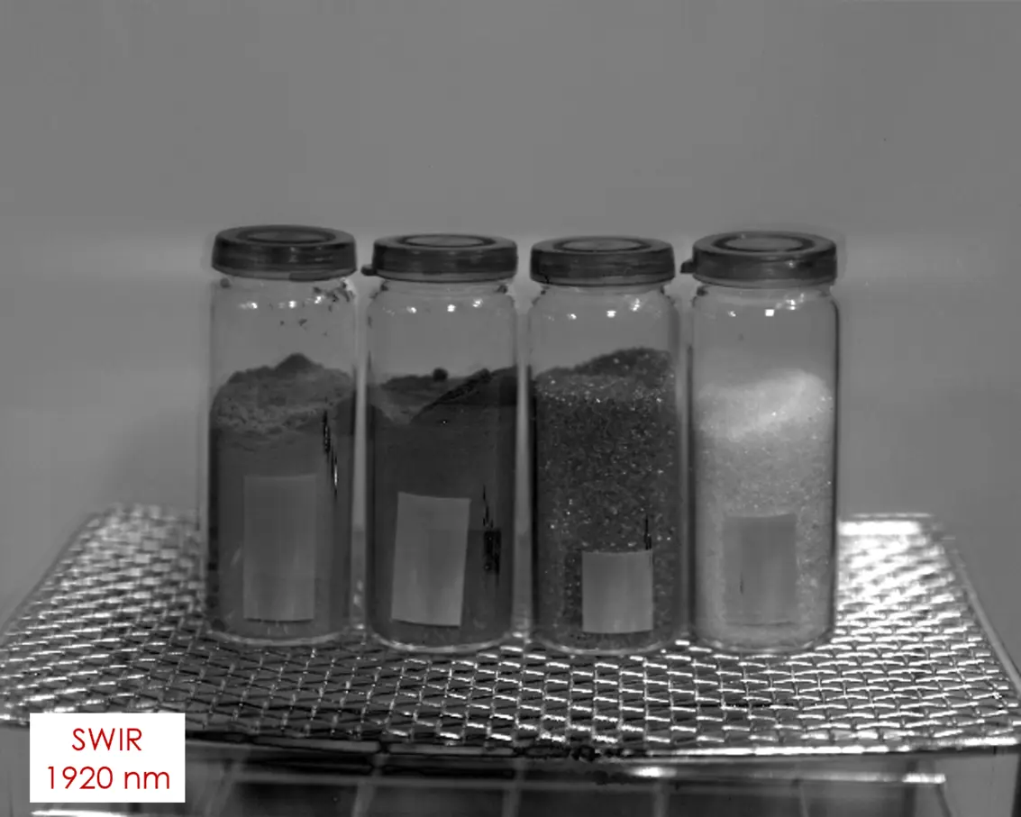 Les types de poudres illustrés de gauche à droite sont l’amidon de pomme de terre, le bicarbonate de soude, le sucre et le sel de table. En utilisant la technologie SWIR, nous pouvons observer des niveaux de contraste différents à des longueurs d'onde spécifiques, ce qui permet de distinguer efficacement les différents types de poudres et de granulés. Cette capacité de différenciation est essentielle dans de nombreuses applications, notamment dans l'industrie alimentaire et pharmaceutique, où il est crucial d'identifier et de contrôler les matières premières avec précision.