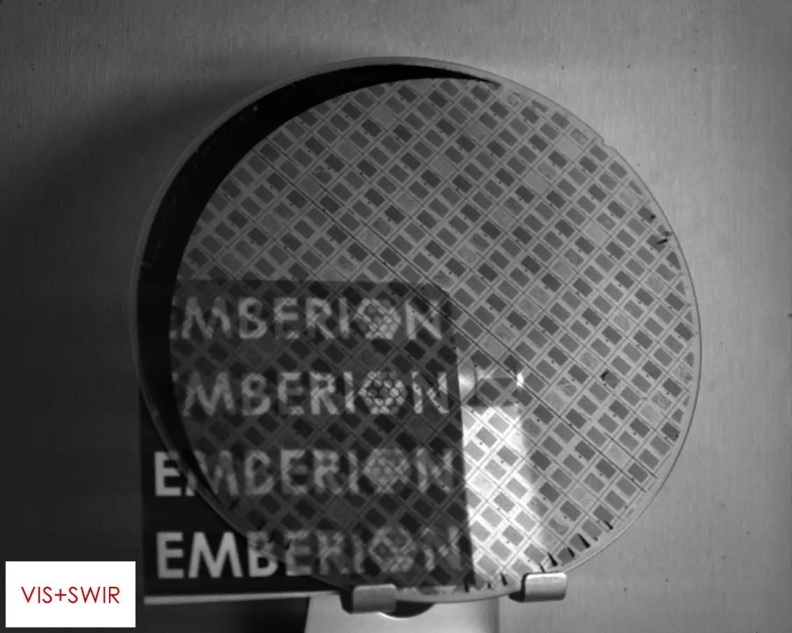 Le Si-wafer est très réfléchissant et opaque en lumière visible, ce qui empêche de voir les objets derrière lui et limite l'inspection à la surface des structures CMOS. En SWIR, il devient transparent, permettant d'examiner les structures internes et arrière.