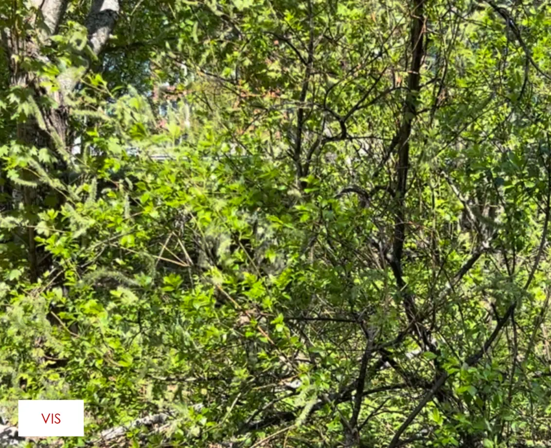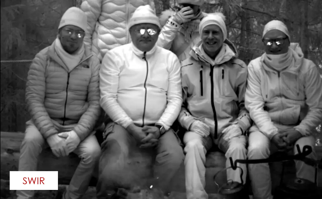 Le camouflage a été détecté derrière les arbres. Bien que l'uniforme militaire soit recouvert d'un revêtement NIR, ce dernier reste vulnérable dans la plage SWIR. Cette limitation souligne l'importance de l'utilisation de technologies avancées de détection, qui permettent d’identifier les menaces potentielles même lorsque des efforts de camouflage sont en place. Les capacités de détection en SWIR offrent un avantage stratégique dans les opérations militaires, en garantissant une surveillance efficace et une identification précise des cibles, même dans des environnements où le camouflage est utilisé.