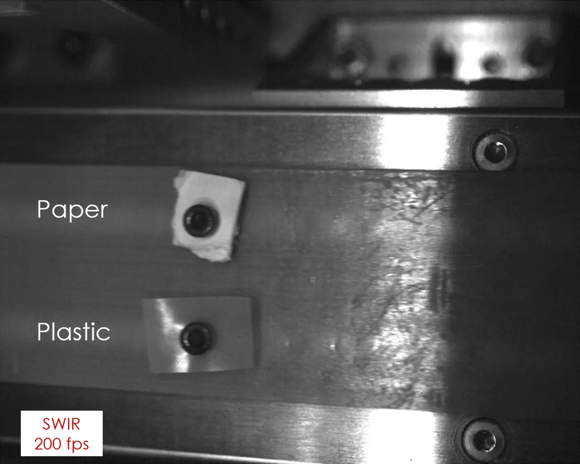 Des échantillons de plastique blanc et de papier sont fixés sur un tapis roulant fonctionnant à une vitesse de 1 m/s. À cette vitesse, une image standard prise avec un iPhone ne peut pas capturer une image claire du tapis roulant. En revanche, grâce à la lumière SWIR, la caméra Emberion VS20 est capable de réaliser un tri optique même lorsque le tapis roulant fonctionne à cette vitesse. Cette technologie permet d’optimiser les processus de tri dans diverses applications industrielles, garantissant une identification précise et rapide des matériaux, ce qui est essentiel pour améliorer l'efficacité opérationnelle.