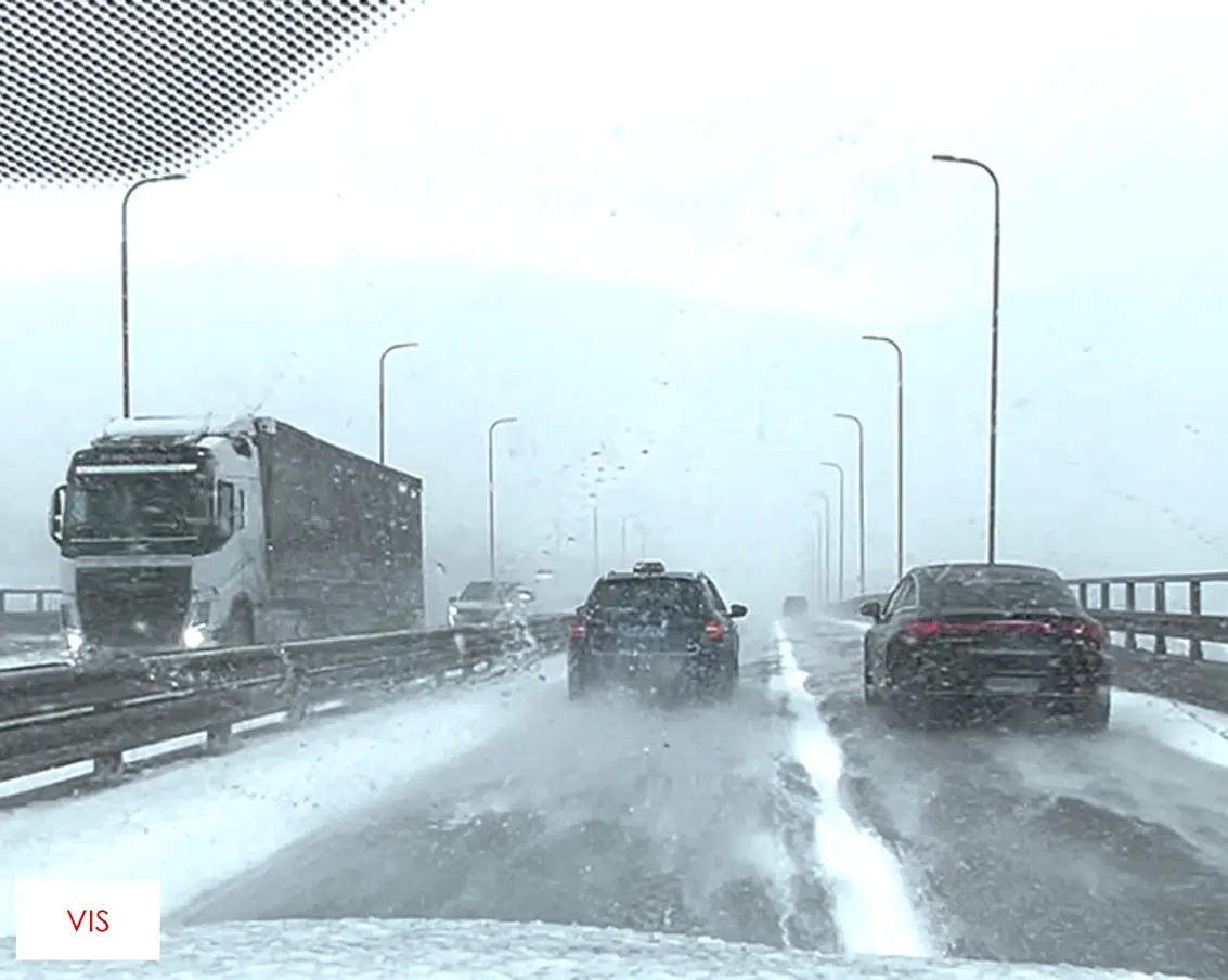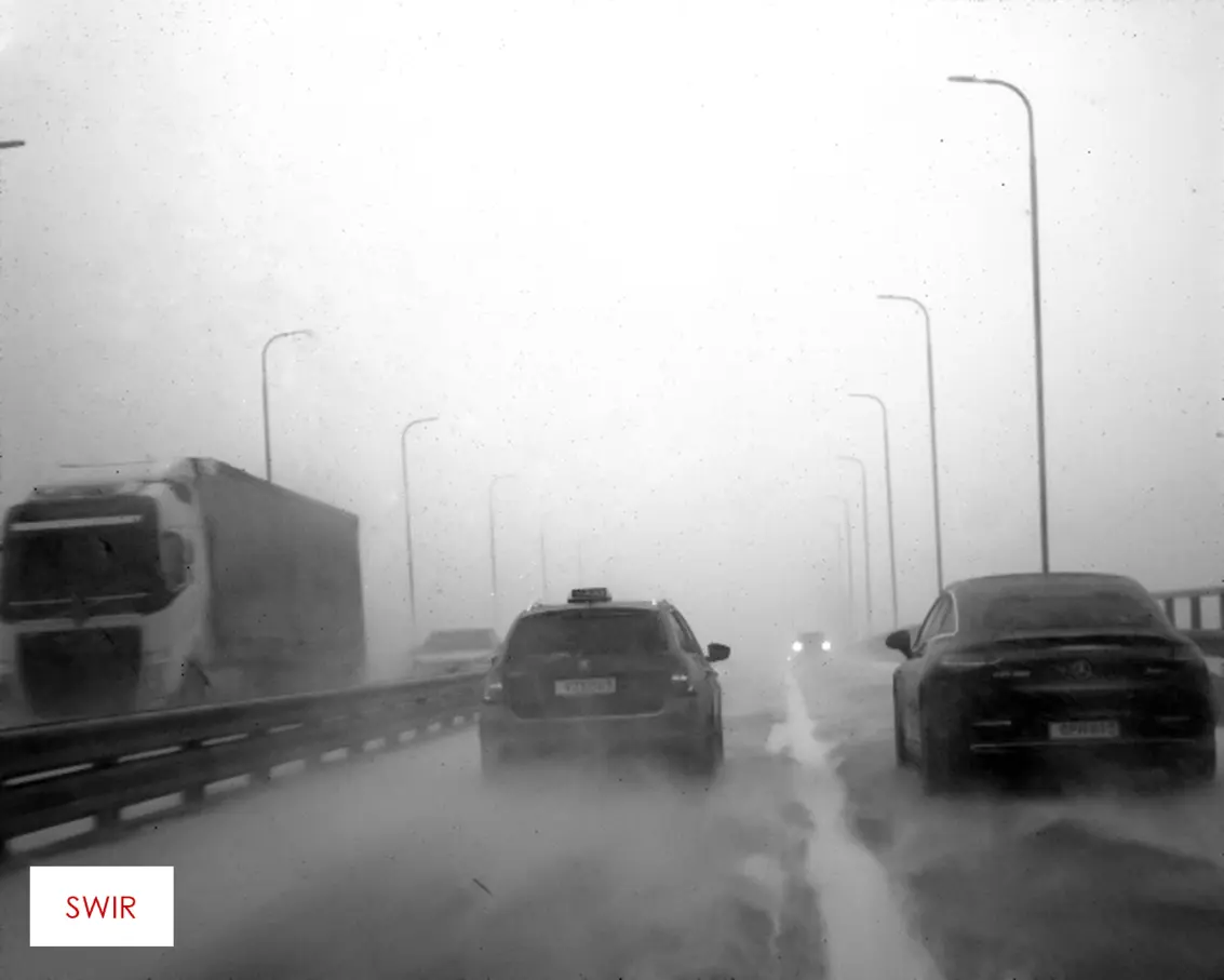 Les flocons de neige en mouvement et l'eau sur le pare-brise ne sont pas visibles en SWIR. Les lumières halogènes et LED apparaissent différemment entre le spectre visible (VIS) et le SWIR. La plaque d'immatriculation est clairement lisible en SWIR, et les interférences causées par le pare-brise sont minimales dans ce spectre.