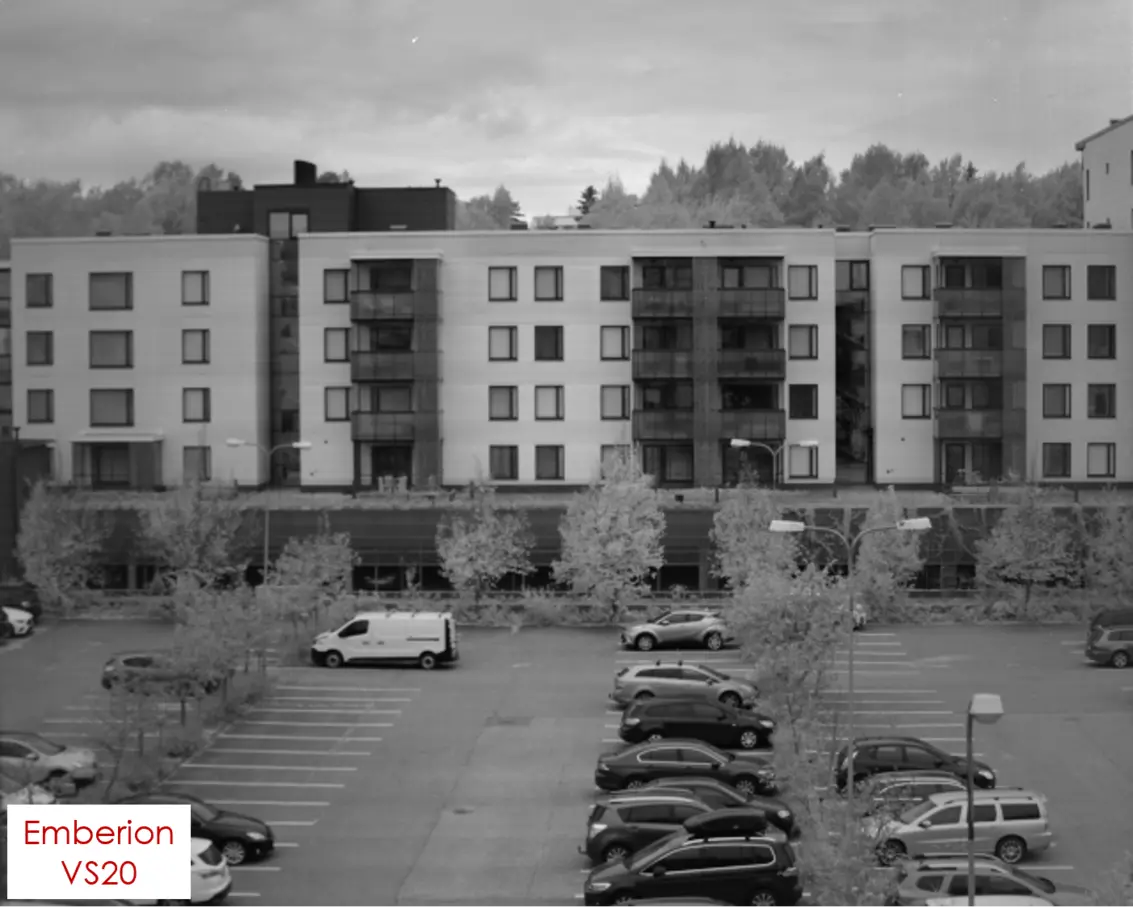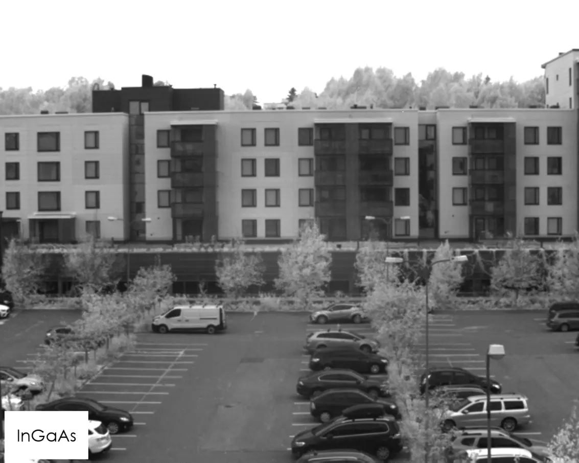 Une image à large spectre VIS-SWIR ressemble à une image en lumière visible, mais présente des différences notables en termes de contraste. Par exemple, les feuilles des arbres apparaissent beaucoup plus claires en infrarouge qu'en lumière visible. La caractéristique de réponse non linéaire et la plage de sensibilité spectrale élargie du capteur Emberion cQD permettent d’obtenir une gamme dynamique plus large. Cela se traduit par des différences de contraste visibles dans des éléments tels que les nuages, les balcons et les vitres de voiture, offrant ainsi une meilleure analyse et identification des détails dans diverses applications.