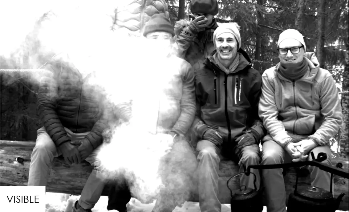 L'image à gauche montre de la fumée visible provenant d'un feu de camp qui obstrue la scène. La même image peut être observée à travers la fumée en utilisant la caméra Emberion VS20 SWIR avec un filtre de 1550 nm. Le SWIR pénètre à travers les particules de fumée, permettant une surveillance dans des conditions défavorables (défense, vision nocturne, lutte contre les incendies, automobile).