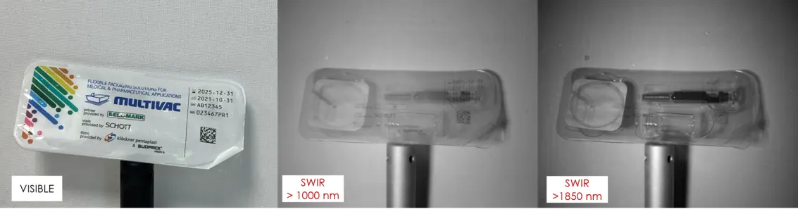 Les flacons sous l'emballage opaque ne sont pas visibles dans le spectre visible (VIS). Dans le spectre SWIR, au-dessus de 1000 nm, le film plastique de l'emballage devient transparent. La meilleure transparence et le meilleur contraste sont obtenus à des longueurs d'onde supérieures à 1850 nm, permettant de voir clairement la bulle d'air dans le flacon.