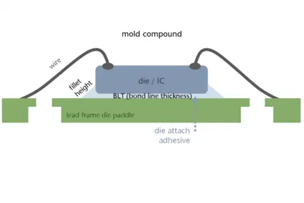 QFNパッケージにおいて、ダイエッジに沿って隆起する接着剤の余剰部分であるダイアタッチフィレットは、機械的安定性に重要な役割を果たします。精密なBLT測定に基づき、フィレット幅、高さ、傾斜角などの関連パラメータを評価・最適化することで、プロセスの堅牢性と部品品質を向上させることが可能です。