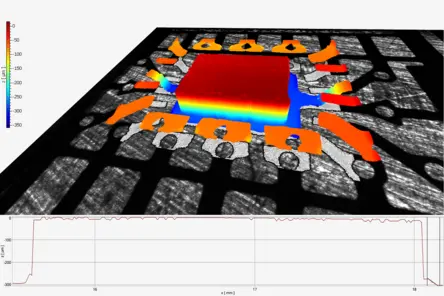 Polytec TopMap 光学式表面プロファイラーは、エポキシダイボンディング工程の高速非接触検査を実現します。ダイの向きや傾斜からボンディングライン厚さに至るまで、生産環境下で直接、自動化された品質管理のための精密な3D表面データを提供します。