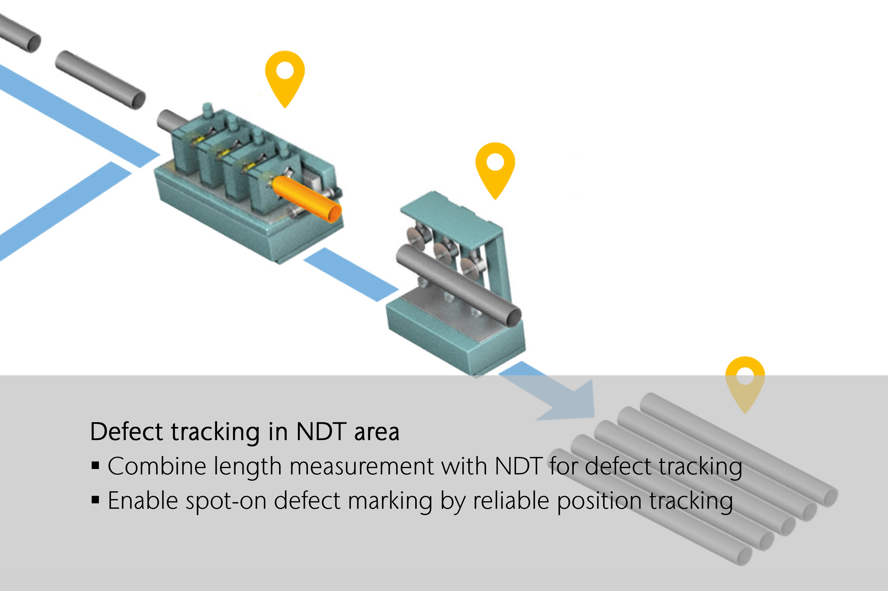 During NDT the tube should be tested to 100% regarding e.g. metallurgical properties and length. The probe conducting this test is stationary, hence the tube is not just pushed forward, but it also rotates on a spiral path. Any flaw detected needs to be described in its longitudinal and rotational position. Here, the non-contact LSV laser sensor comes into play: Being insensitive to out-of-plane motions, it is the preferred optical solution for such setups. One unit keeps track of the longitudinal progress while a second unit monitors the rotation. Specialized accessories for such demanding application master electromagnetic inspection (E.M.I.), magnetic powder inspection (MPI), and other test methods.