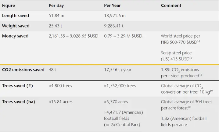 Taking a 5-strand billet caster with 220 square millimeter billets cut to 6-meter length each and considering the density of steel as 7,85 kg/dm³, the cast billets produced weigh 379,94 kg/m. A typical caster would operate at 900 mm/min cast speed at a 24h/day operation. Bringing together the numbers results in 1,080 cuts a day, considering all 5 strands. Using measurement wheels or similar technology in a rough environment will lead to an average accuracy of 1% whereas using an LSV realistically will provide an accuracy of 0,1%. So, the average improvement per cut is roughly 24mm. The resulting figures of this improvement are shown in table 1.