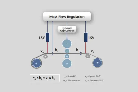 金属の加工にはマスフローコントロールが不可欠です。マスフロープロセスの制御とは、最終製品の板厚ができるだけ一定になるようにロールギャップの幅を制御することです。ロールスタンド前の板厚とロールスタンド前後の速度がわかれば、圧延製品の板厚を決定するロールギャップを所望の条件に合わせて調整することができます。