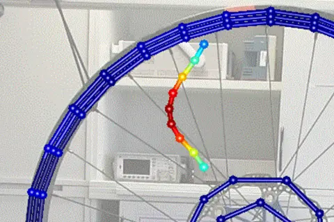 VibroScan QTec Xtra 3D スキャニング振動計はQTecによる光学感度の向上だけでなく、形状測定レーザの精度も大幅にアップしています。測定点の座標情報を今まで以上に正確に捉えることができるため、太さ10㎜にも満たない自転車用ホイールのスポークであっても3本のレーザを正確に照射、3次元振動を測定・可視化できます。