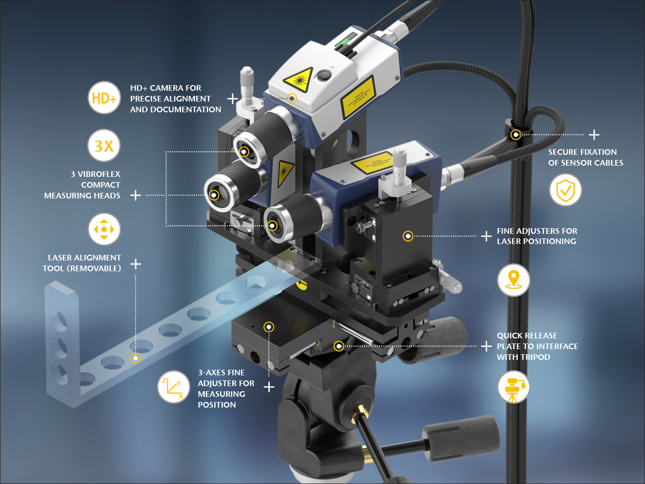優れた光学感度を持つVibroFlex Compactセンサーヘッドは、センサー用ホルダーに簡単に取り付けることができます。統合カメラを備えた1つのセンサーヘッドを上部に取り付けることも可能で、測定セットアップや試験の記録を簡略化します。3D測定用センサーホルダーはVibroFlex CompactおよびVibroOneセンサーヘッドに対応しており、安定した測定と操作のために三脚に取り付けるのが理想的です。