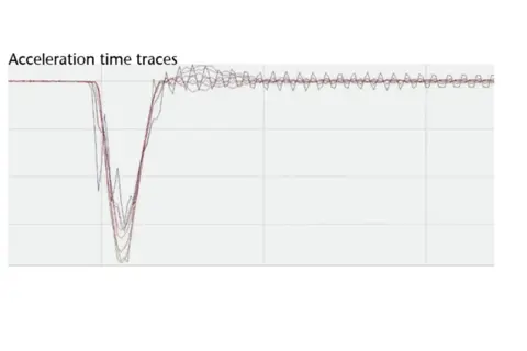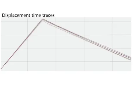 During the measurement the velocity was recorded as a function of the time. The measurement also allowed to record the velocity of the watch case for 8 specific measurement points during approximatively 8 ms; 3 ms before the impact and 5 ms after the impact. An overlay of the velocity traces allows for a comparison of the different measurement points and can be seen in the displacement graph. The graphs also show different behaviors during the impact.